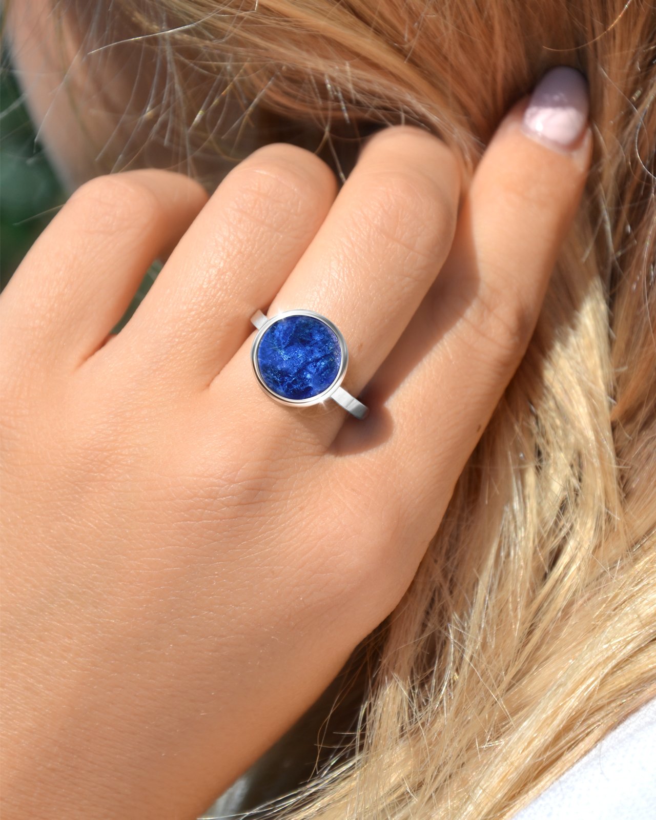 La bague Amaronia est en acier, sertie de sa magnifique Sodalite aux nervures blanches.