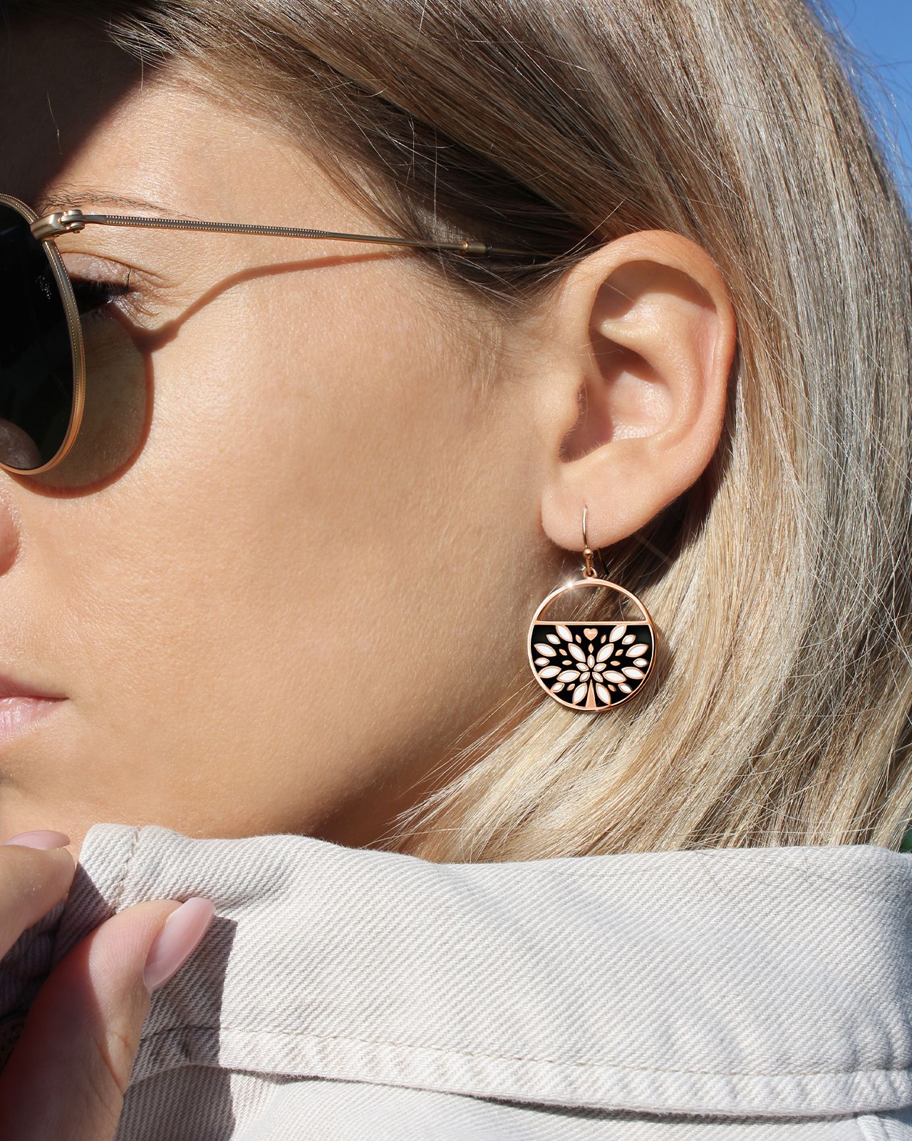 Le noir intense de ces boucles donnera du caractère à vos tenues tout en leur apportant une touche fantaisie grâce à cet acier rosé émaillé.