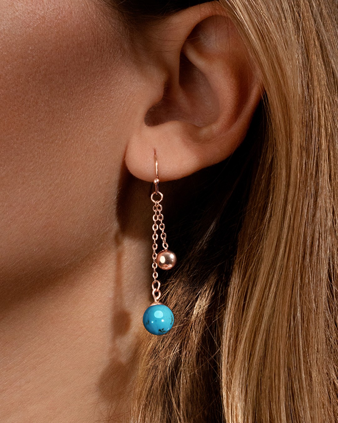 Les boucles d'oreilles pendantes Atraniti sont ornées d'une pierre en turquoise et d'une boule en acier rosé, délicatement suspendue.