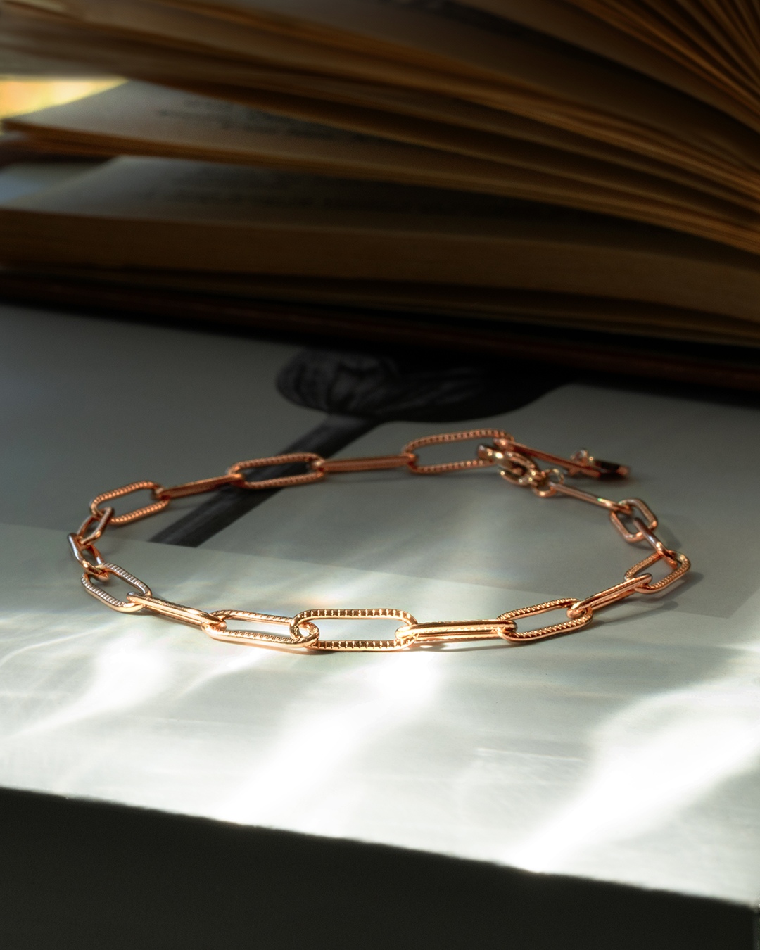 Le bracelet Gaia Rosa est composé d'une chaine, ornée de délicats maillons martelés, en acier rosé inoxydable.