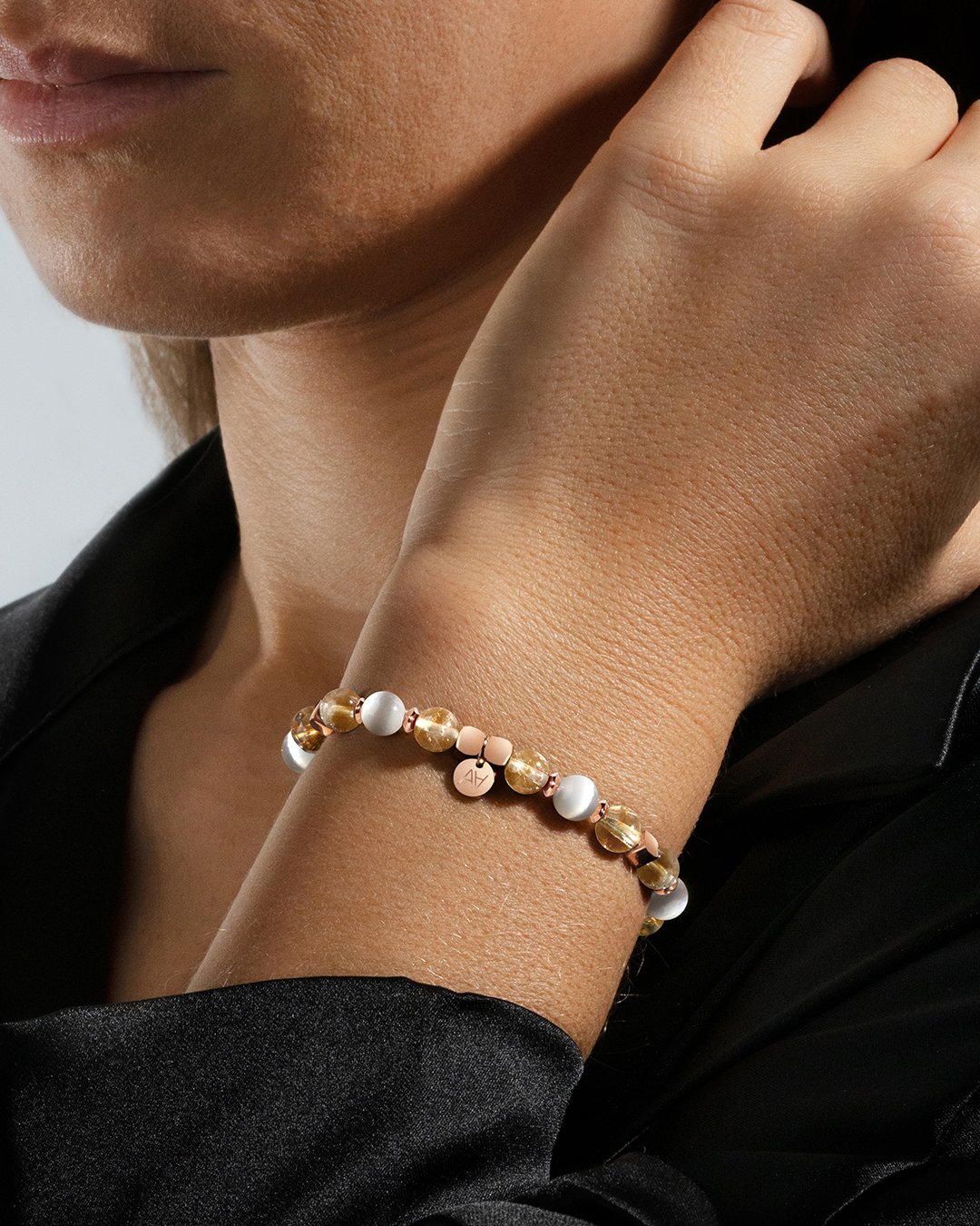 L'énergie solaire de la Citrine s'entrelace avec la douceur luminescente de la Sélénite, faisant de ce bracelet un talisman d'équilibre et d'harmonie pour le corps et l'esprit. Cette association rappelle le jeu perpétuel entre le yin et le yang, entre la force dynamique et la quiétude réconfortante.