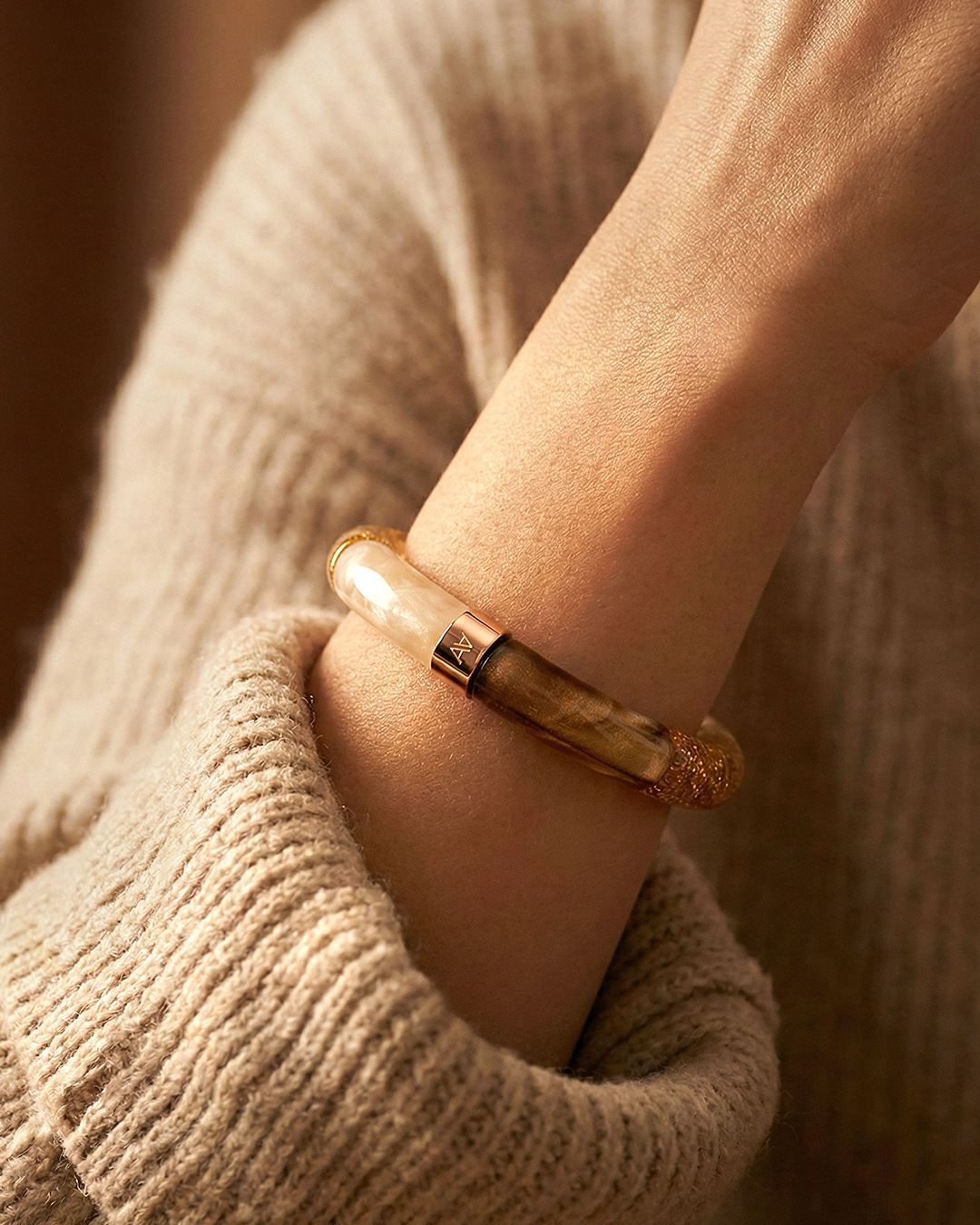 Le bracelet est composé d'éléments raffinés d'une couleur Beige marbré, Doré pailleté, Brun pétrole.