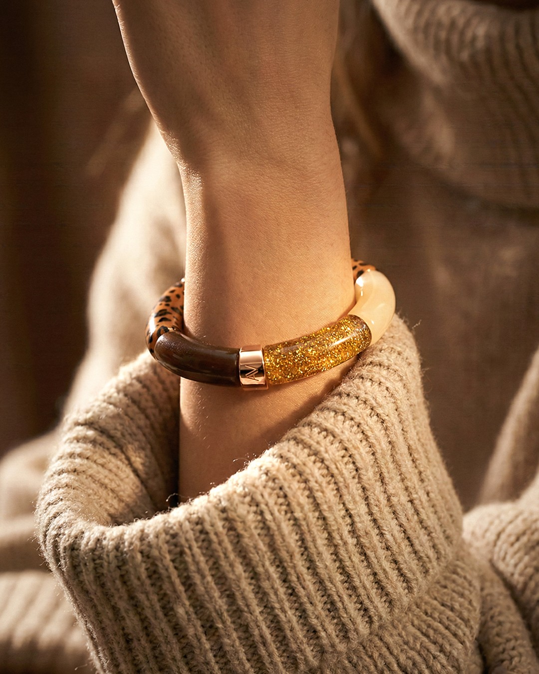 Laissez-vous séduire par ce bracelet en acétate artisanal, symbole d’un luxe accessible et d’une mode responsable.