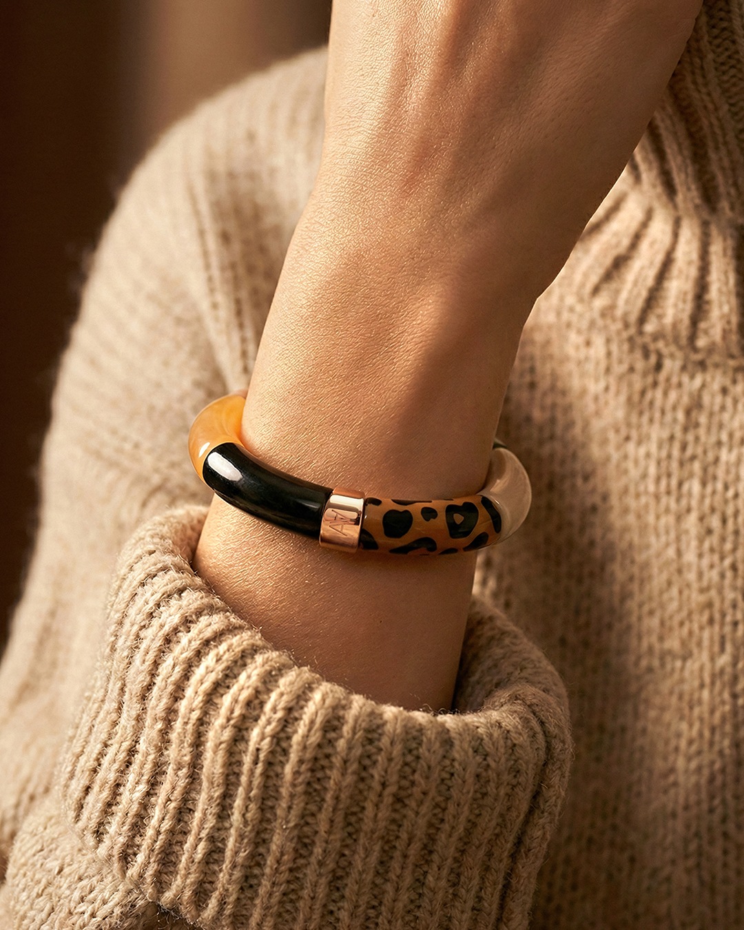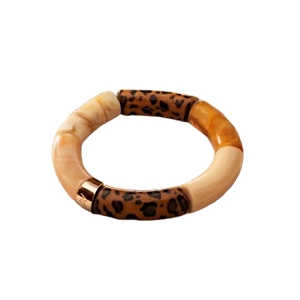 Le bracelet est composé d'éléments raffinés d'une couleur Noir, Orange cuivré, Camel mat, Vert marbré foncé, Beige latte, Marron léopard.