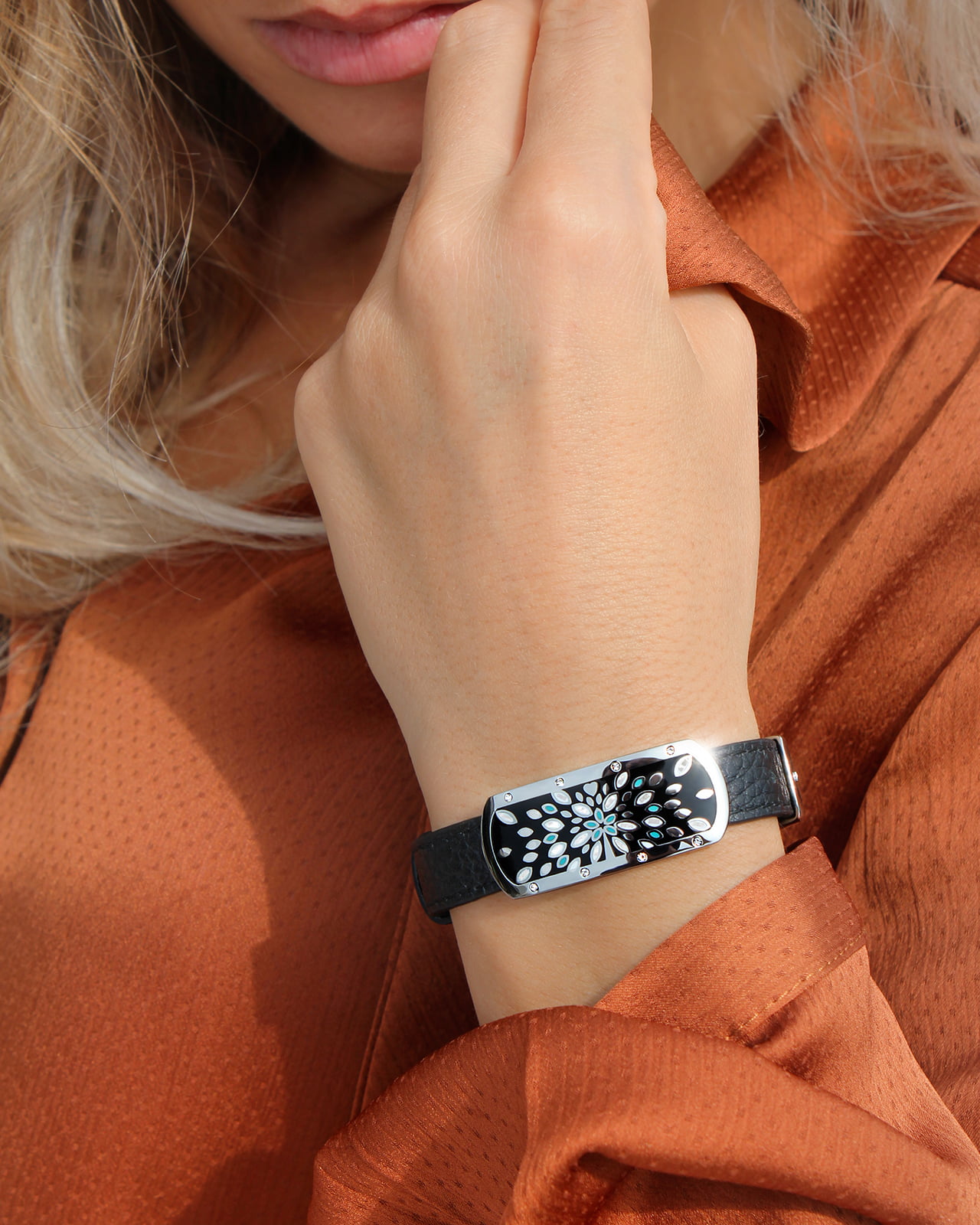 Le noir de son bracelet cuir vient à son tour faire ressortir la beauté de ce bijou tout en offrant une touche d'élégance à vos tenues.