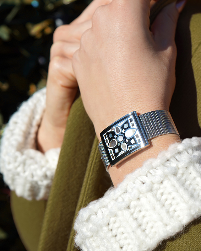 Son élégant bracelet en maille milanaise apporte la touche de légèreté qu'il fallait au dessin imposant qui décore sa plaque en acier.