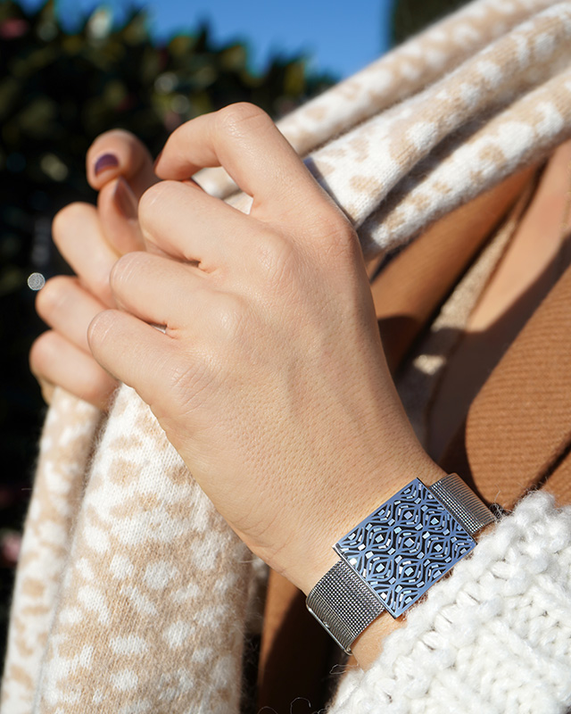 Son bracelet milanais ramène l'équilibre en contrebalançant avec discrétion les motifs de sa boucle en acier.