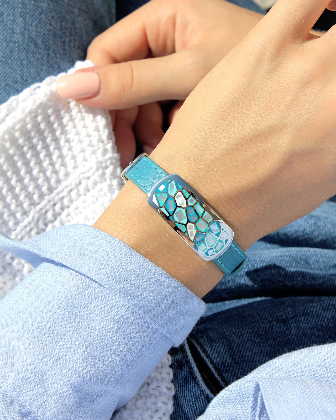 Le bleu turquoise de son bracelet cuir fait ressortir la beauté de ce bijou tout en apportant une touche colorée à votre tenue.