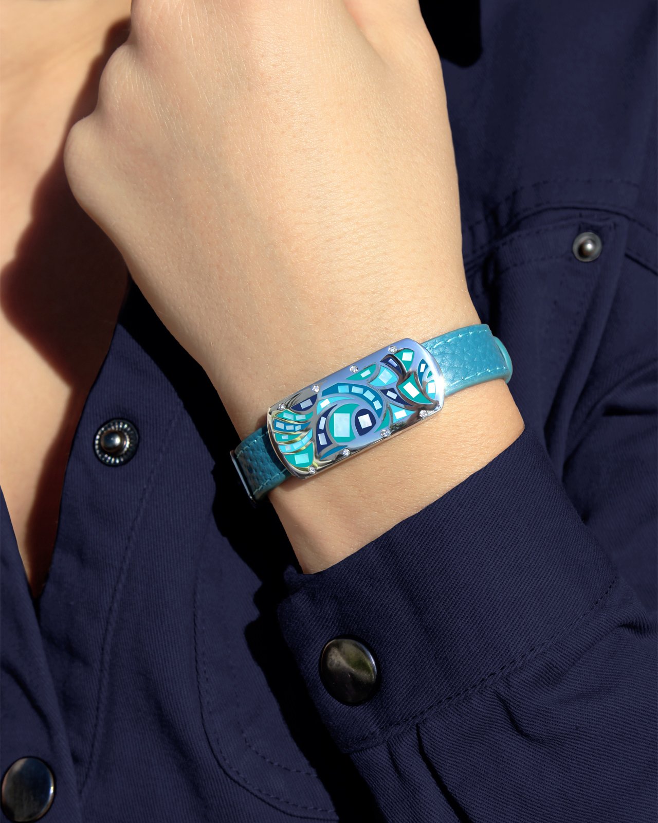 Le bleu turquoise de son bracelet cuir sublimera votre poignet.