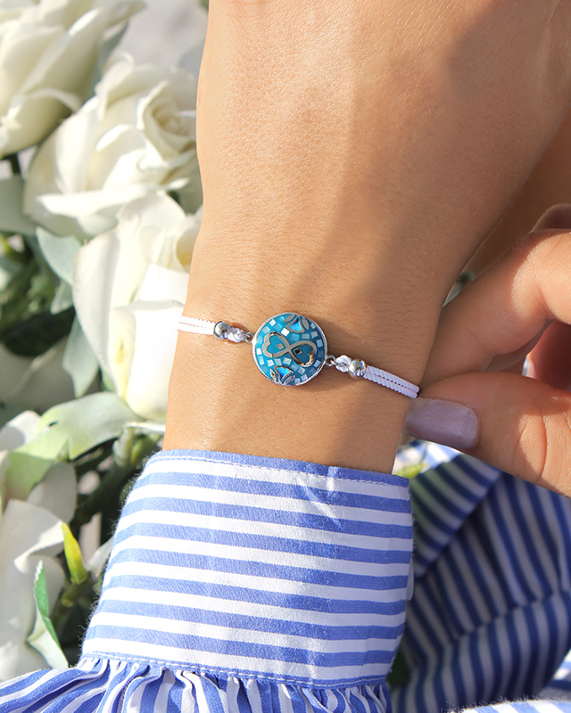 Le blanc de son bracelet en coton met en valeur la beauté de son émail bleu canard.