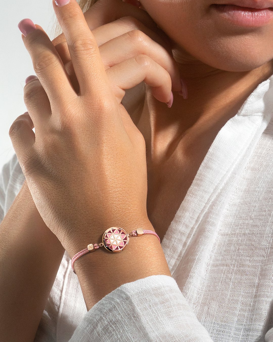 Son bracelet en coton combiné à sa chaîne viendra somptueusement s'allier avec vos looks du quotidien.