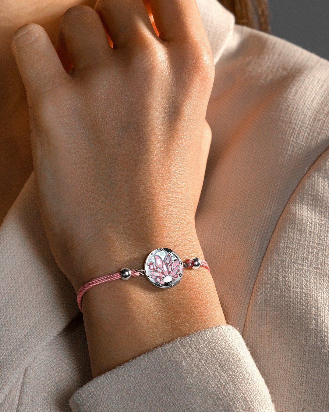 Le rose pâle de son bracelet coton habillera avec élégance vos tenues et fera de lui l'accessoire essentiel à votre look !