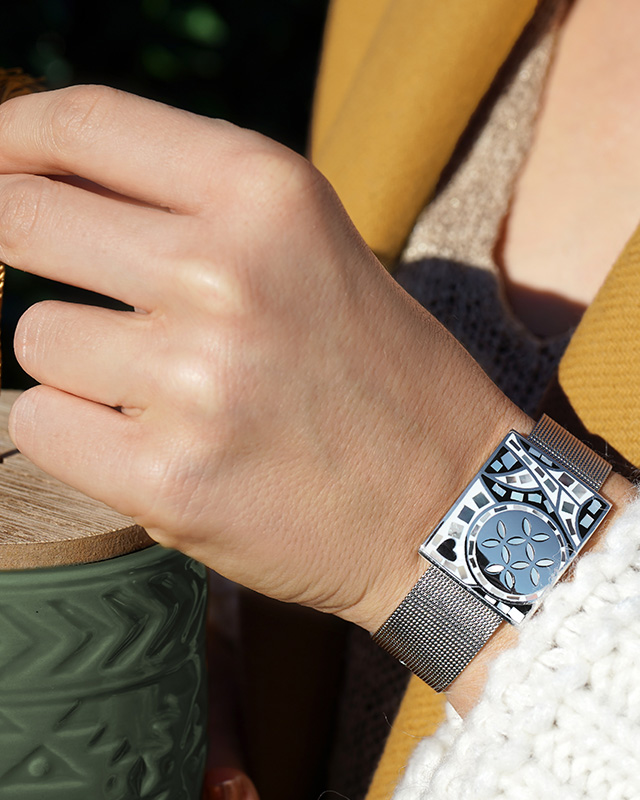Son bracelet en maille milanaise au design minimaliste et contemporain fait entrer toute tenue dans un chic absolu.