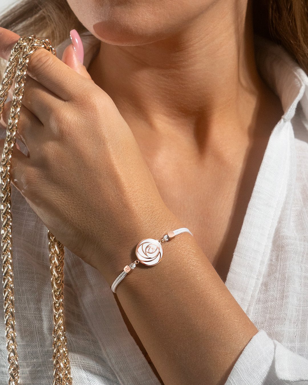 Son bracelet en coton combiné à sa chaîne viendra somptueusement s'allier avec vos looks du quotidien.