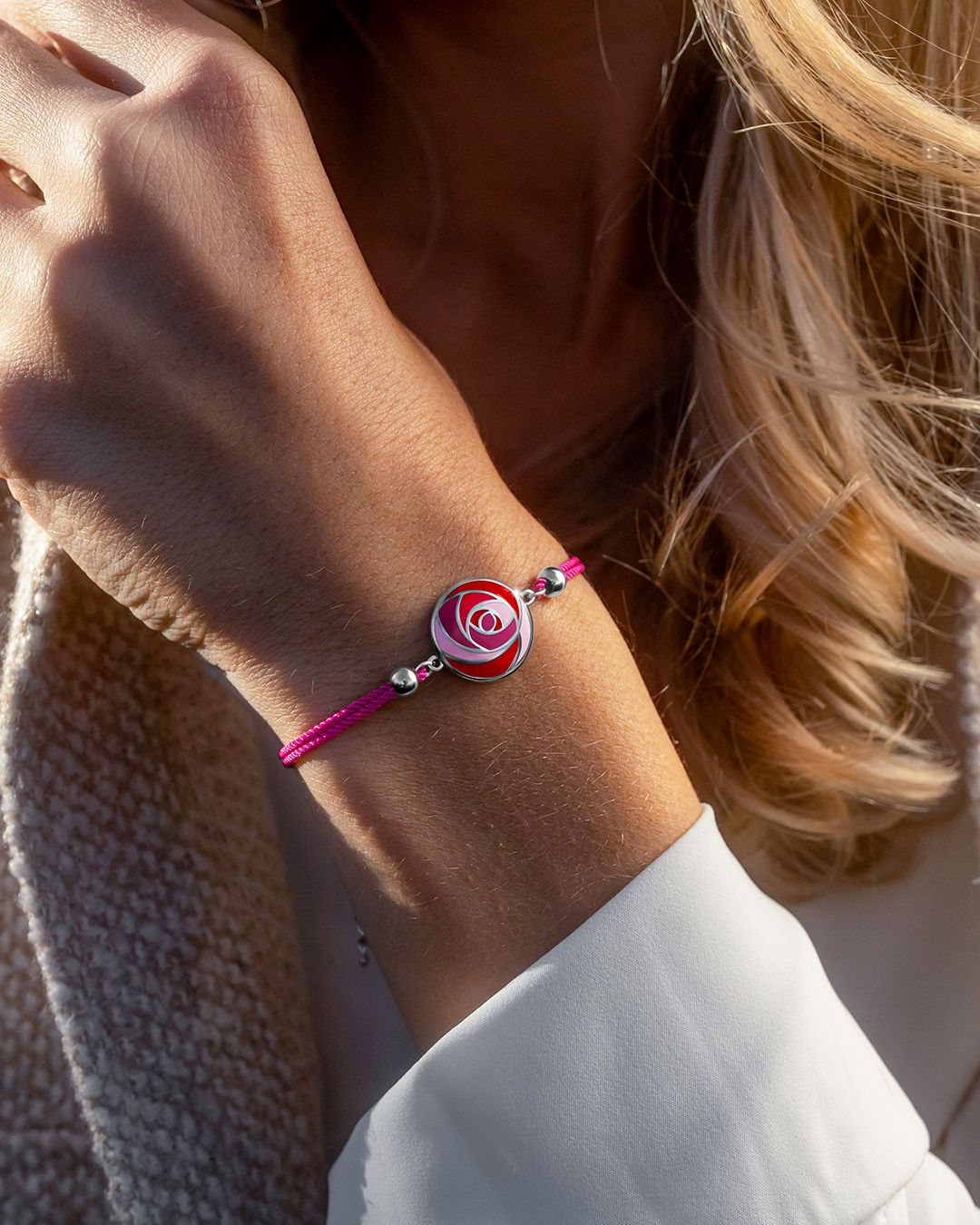 Le rose de son bracelet coton viendra élégamment sublimer votre tenue.