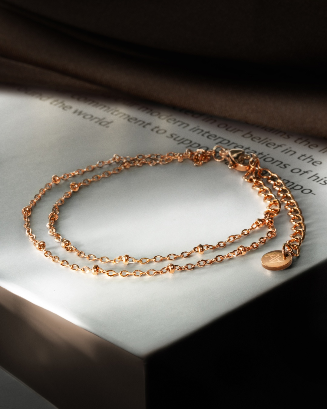 Le bracelet Mayana Rosa est un bracelet double, ornée de petites perles en acier rosé inoxydable.