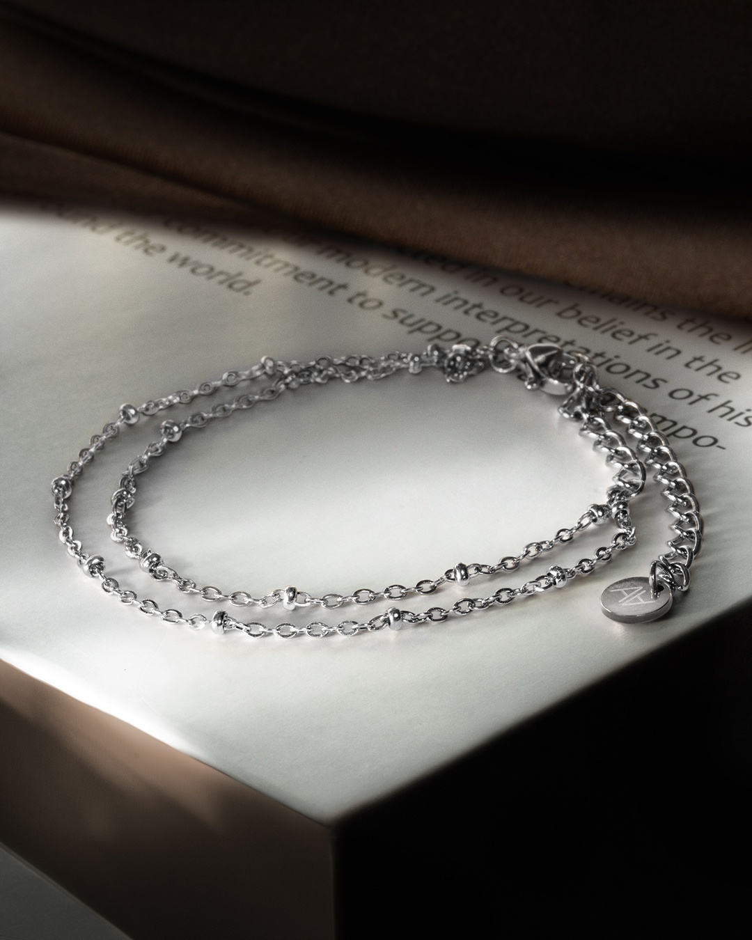 Le bracelet Mayana se présente comme bracelet double, ornée de petites perles en acier argenté inoxydable.