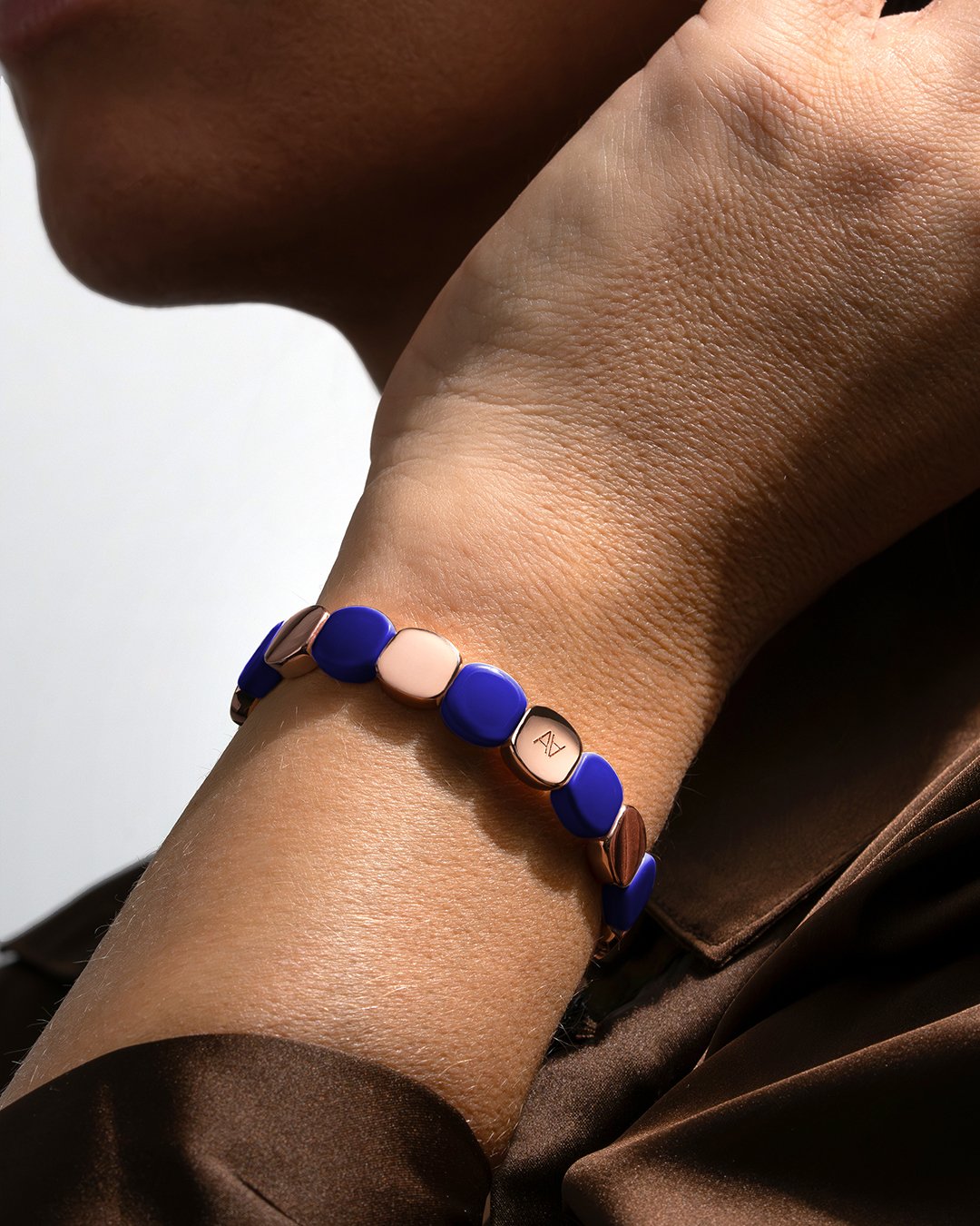 Raffiné et lumineux, il séduit par son jeu d’alternance délicat entre le métal rosé et le métal bleu foncé, créant un contraste subtil qui capte la lumière avec grâce.