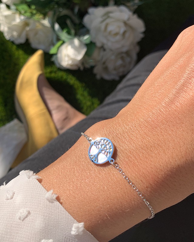 Le bracelet Albero est composé d'une pièce de nacre enveloppée de son motif en acier inoxydable.
