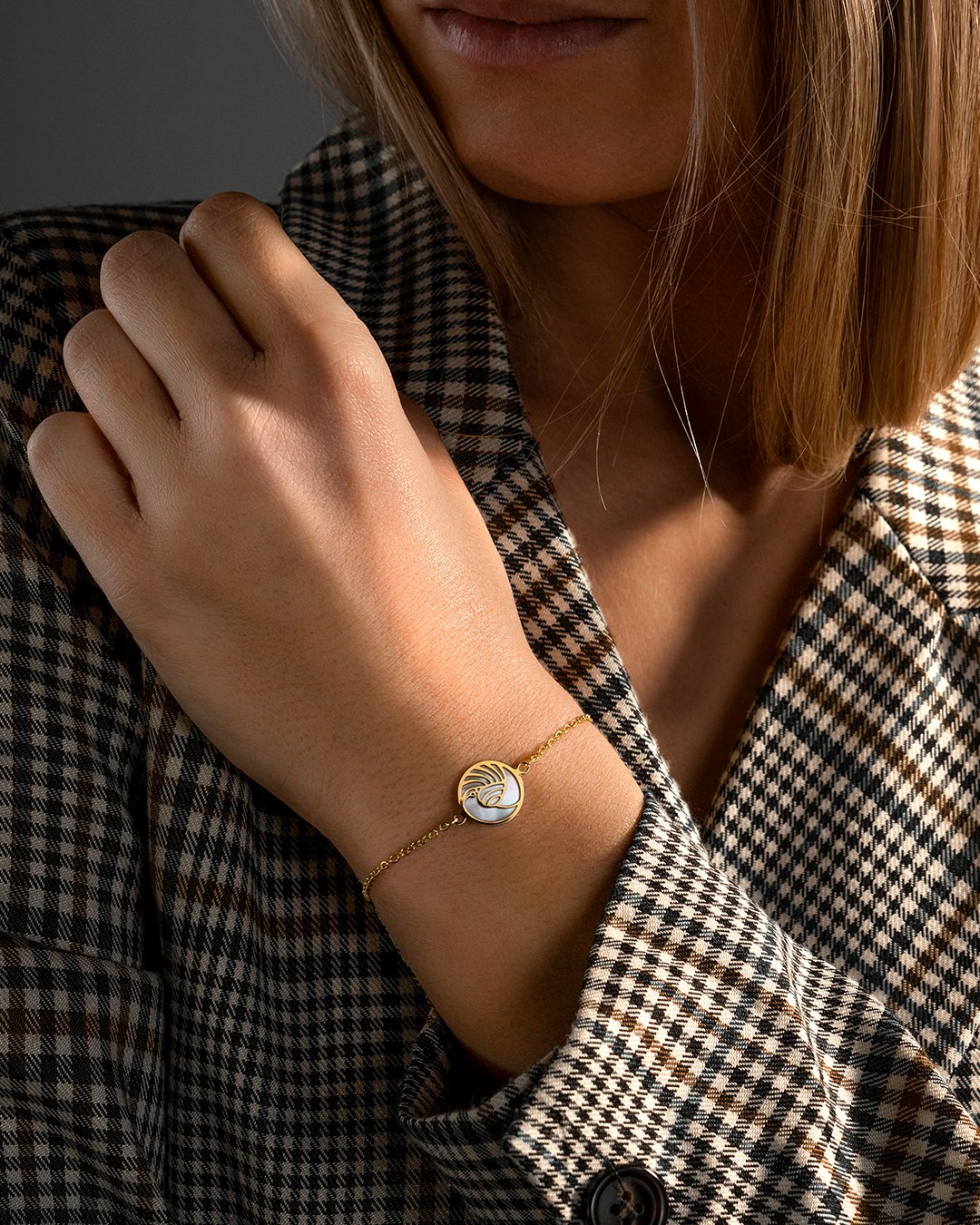 Le bracelet Colombetti Doro est composé d'une pièce de nacre et d'une chaînette en acier inoxydable dorée.