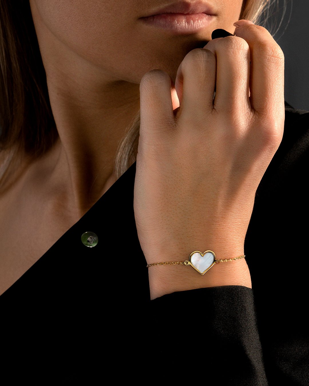 Le bracelet Cuoretti Doro est composé d'une pièce de nacre accompagnée d'une chaînette en acier inoxydable dorée.