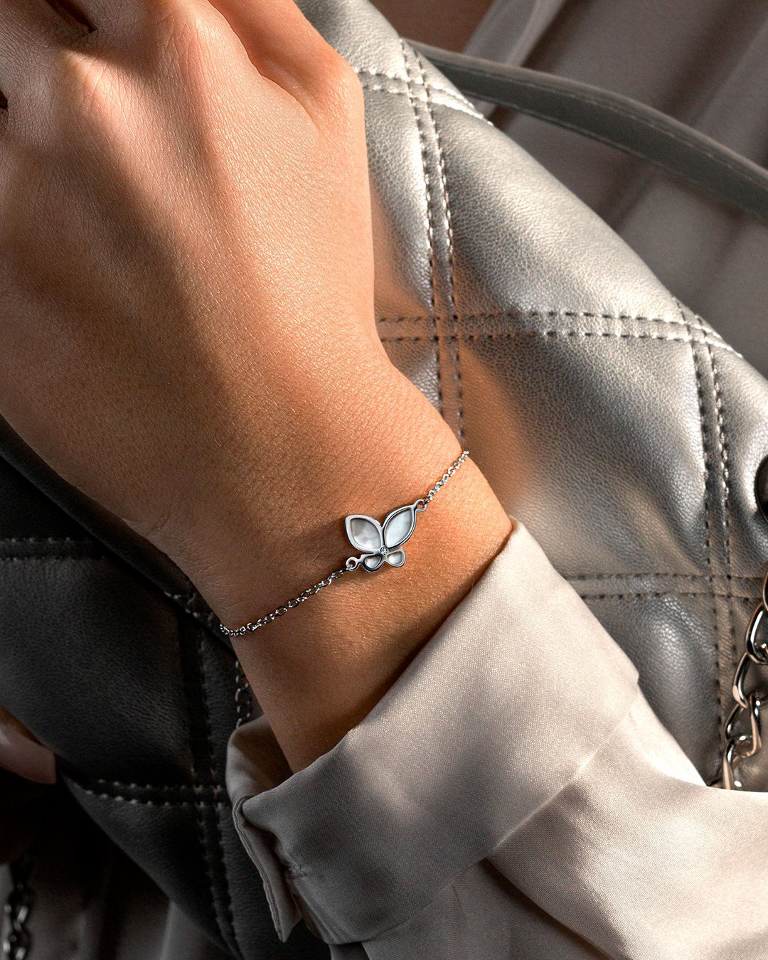 Le bracelet Farfallatti est composé d'une pièce de nacre accompagnée de sin strass et d'une chaînette en acier inoxydable.