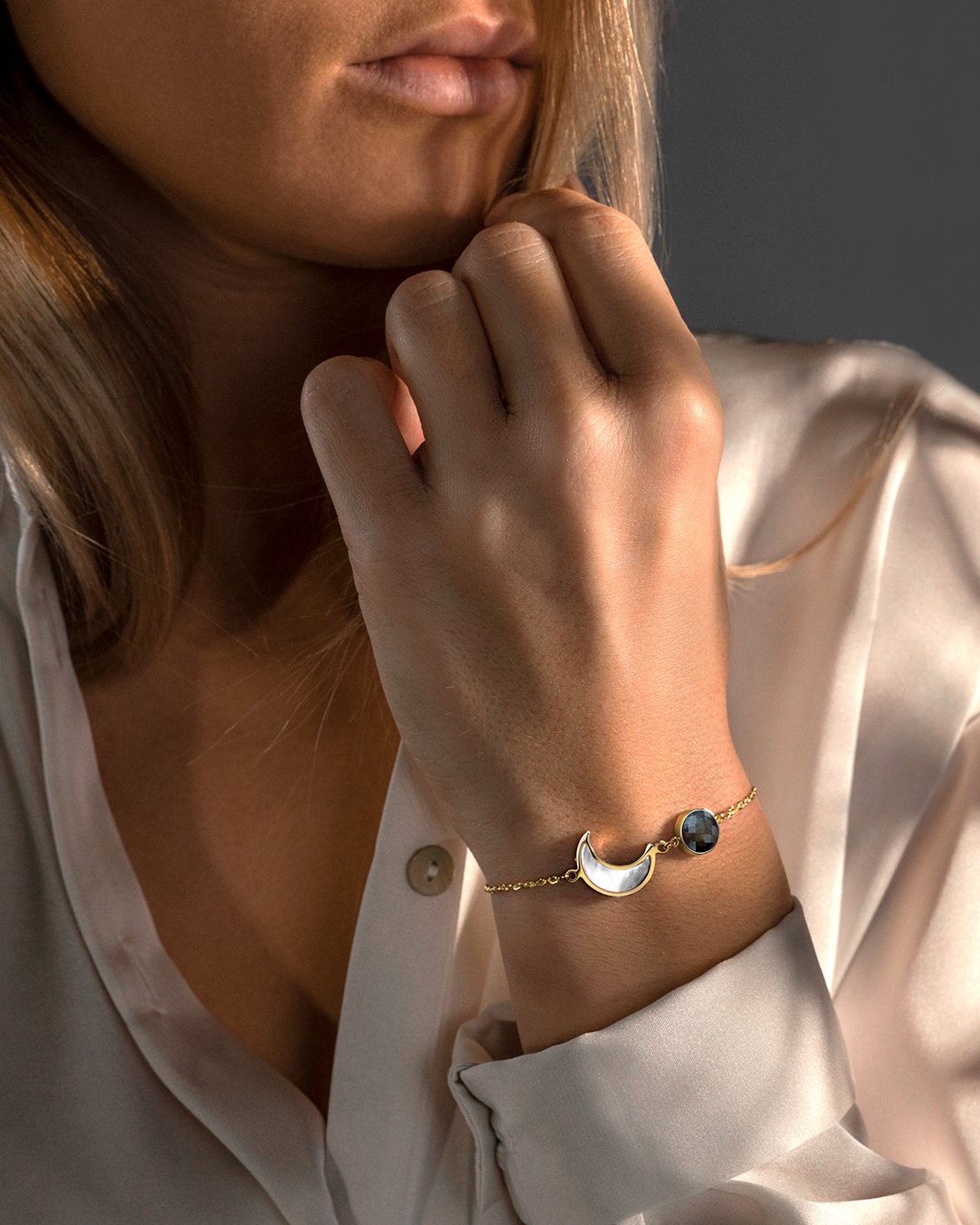 Le bracelet Luna Doro en acier inoxydable doré est composé d'une pièce de nacre accompagnée de sa labradorite.