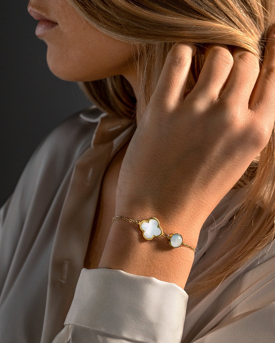 L'association des pierres d'une douce couleur blanche et du bracelet en acier permettra de compléter toutes vos tenues.