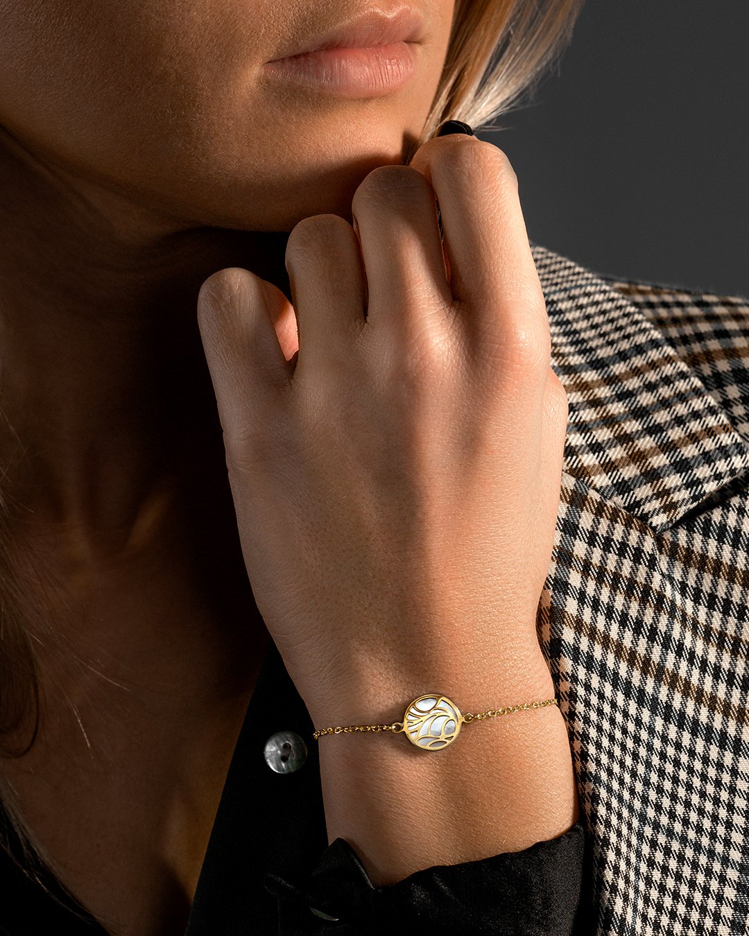Le bracelet San Felicetti Doro est composé d'une pièce de nacre accompagnée d'une chaînette en acier inoxydable dorée.