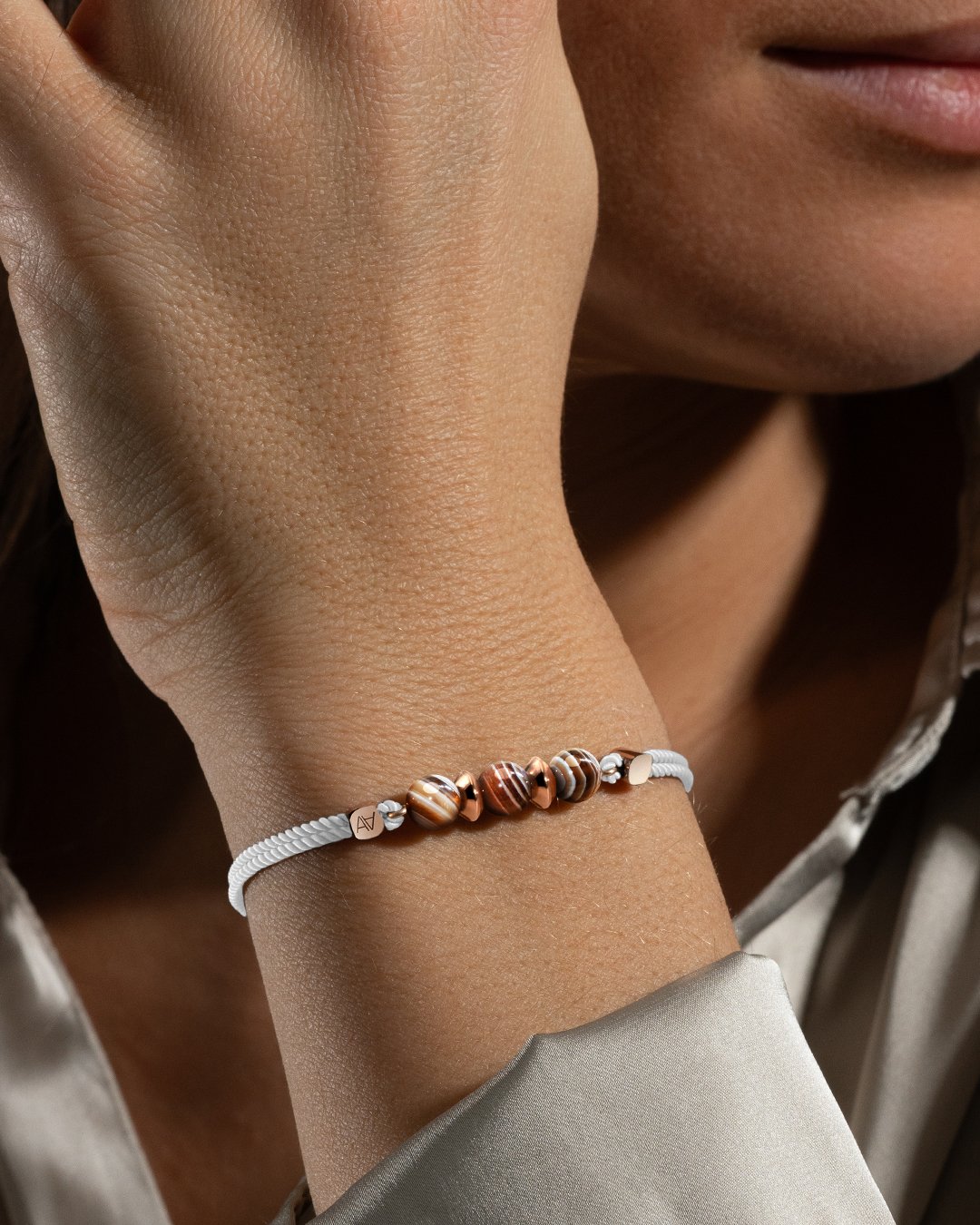 Le bracelet Avenito incarne l'élégance, mêlant harmonieusement un cordon en coton finement tissé, des composants en acier doré à l'or fin rosé méticuleusement poli à la main, et trois perles de Agate du Botswana d'une beauté exceptionnelle, chacune capturant l'essence de la sophistication.