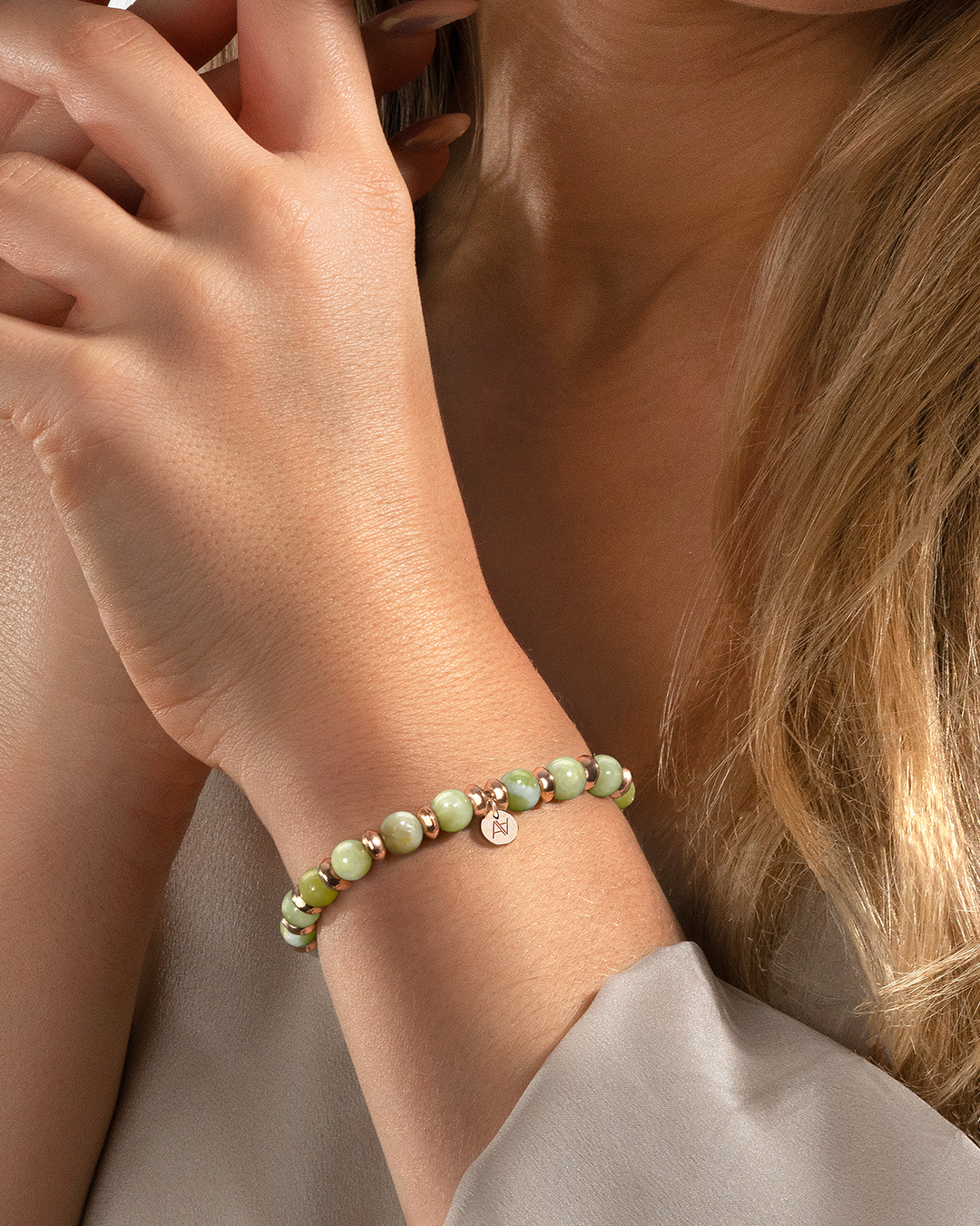 • Matière du bracelet Acier rosé inoxydable et jade de Péridot