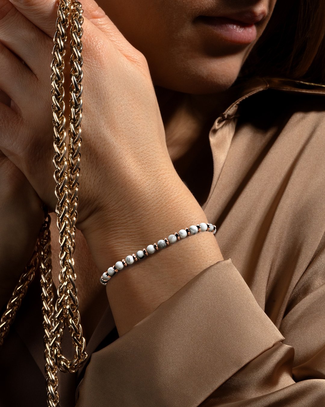 • Matière du bracelet Acier rosé inoxydable et howlite