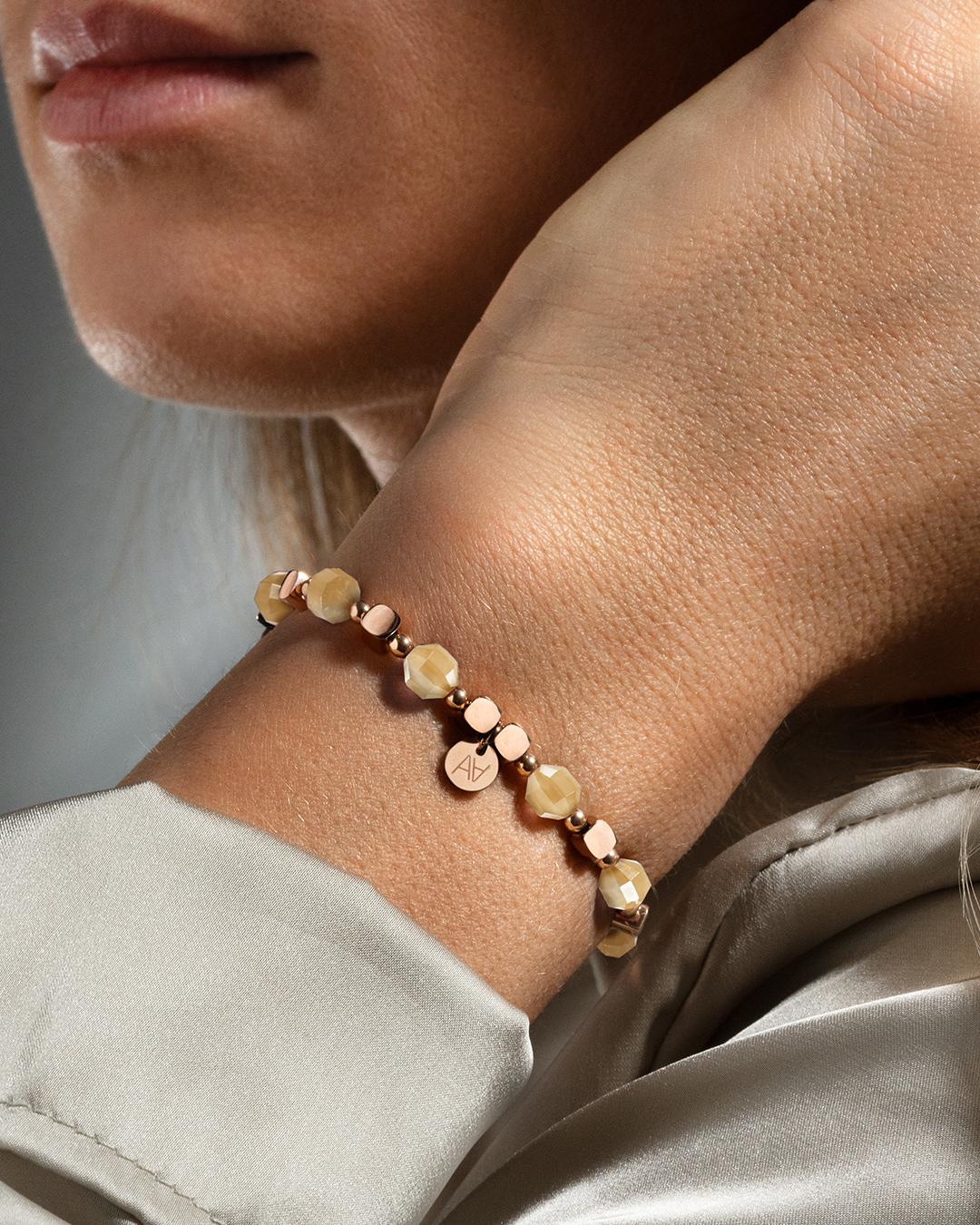 L'élément central de ce bracelet est une pastille signée Anna Velazia, confectionnée à la main, en acier doré à l'or fin rosé.