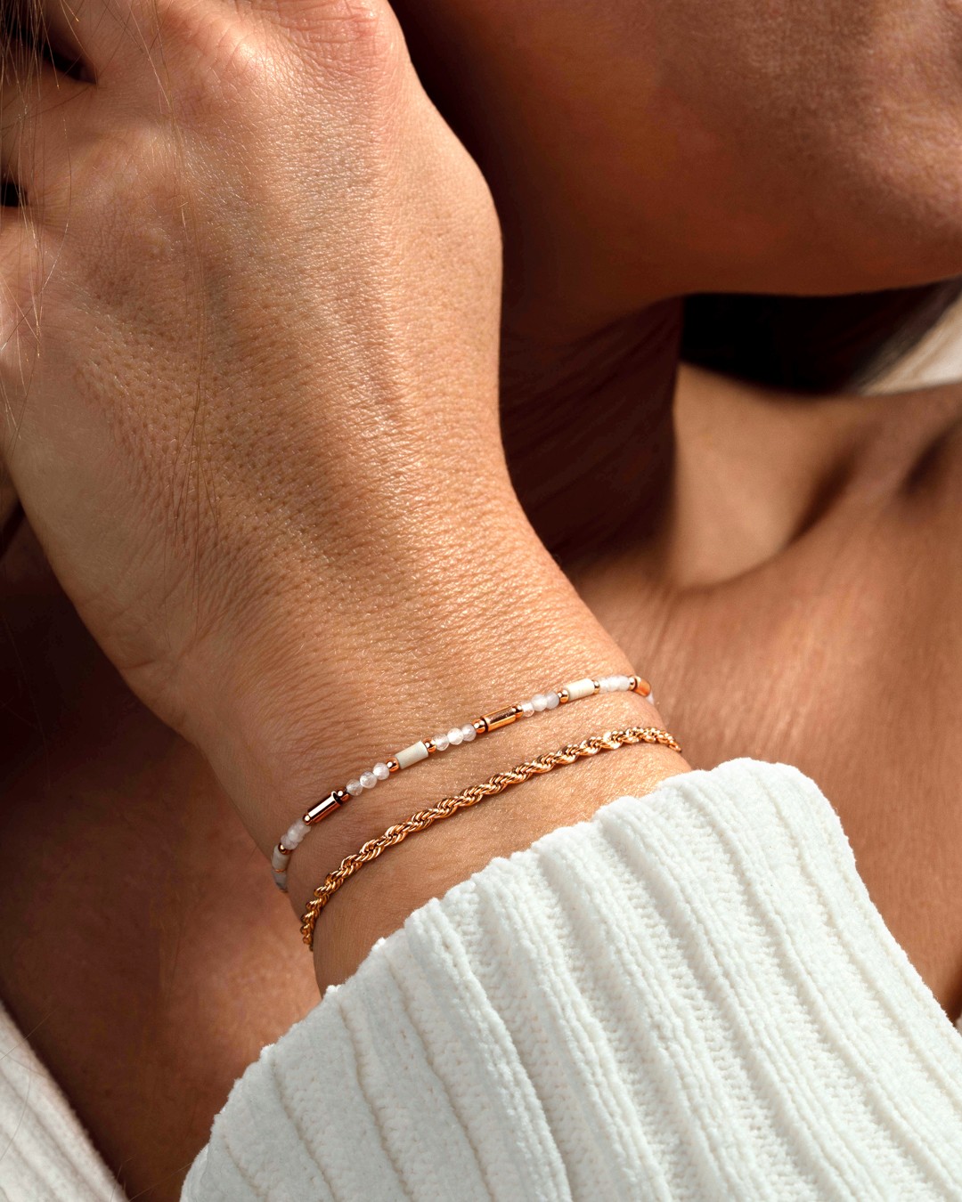 Le bracelet Vigolina se compose de perles facettées de Pierre de Lune, connue pour ses vertus apaisantes et intuitives, et de tubes en Marbre Blanc, pierre réputée pour apporter équilibre et harmonie intérieure.