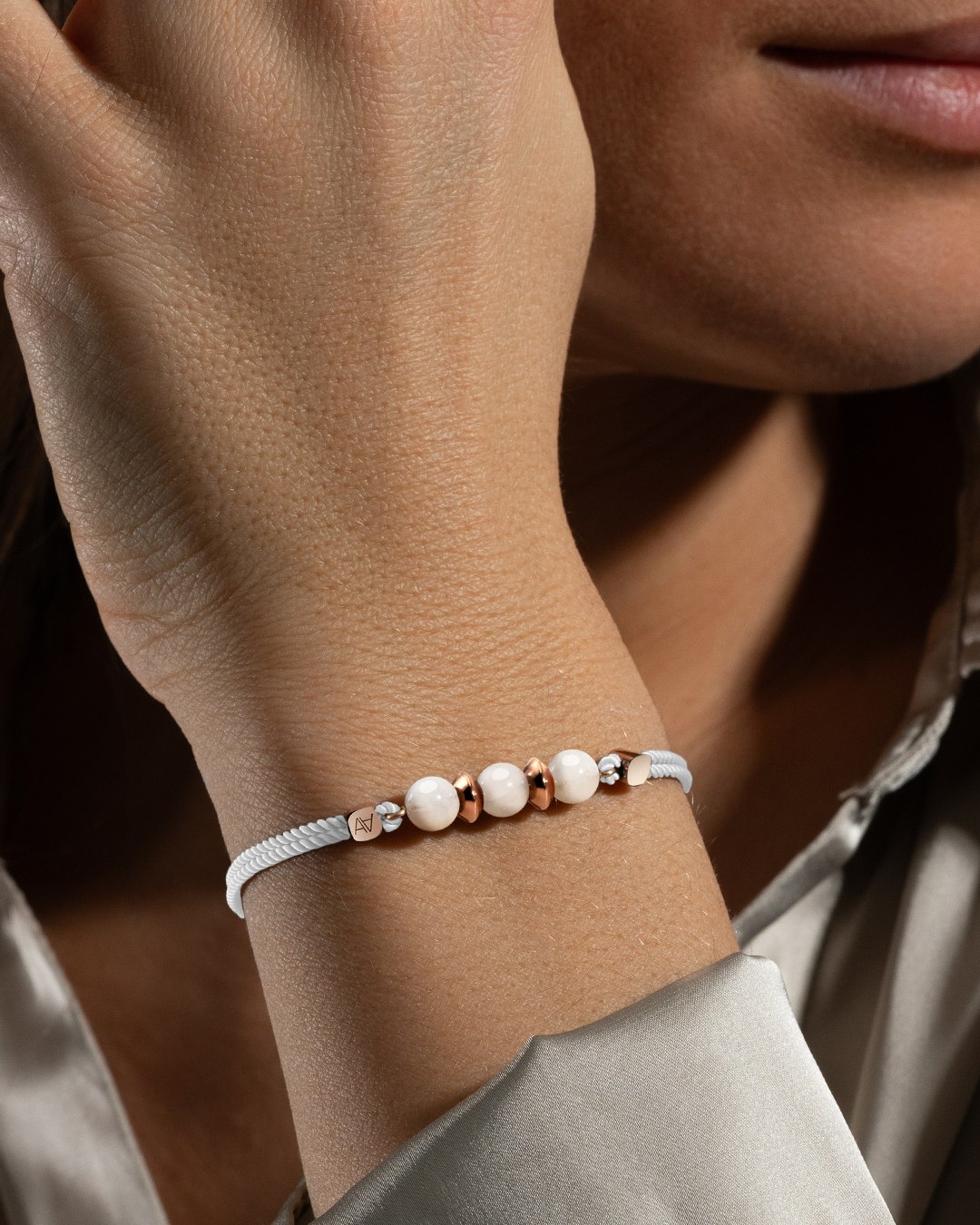 Le bracelet Millazeto incarne l'élégance, mêlant harmonieusement un cordon en coton finement tissé, des composants en acier doré à l'or fin rosé méticuleusement poli à la main, et trois perles de Pierre de Lune d'une beauté exceptionnelle, chacune capturant l'essence de la sophistication.