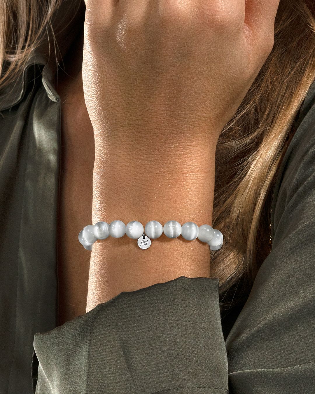 Le bracelet Verona est composé de pierres de sélénites. Ce bracelet constitué de pierres naturelles de taille 8mm, est orné d'une pastille signée Anna Velazia. La pastille est en acier argenté inoxydable.