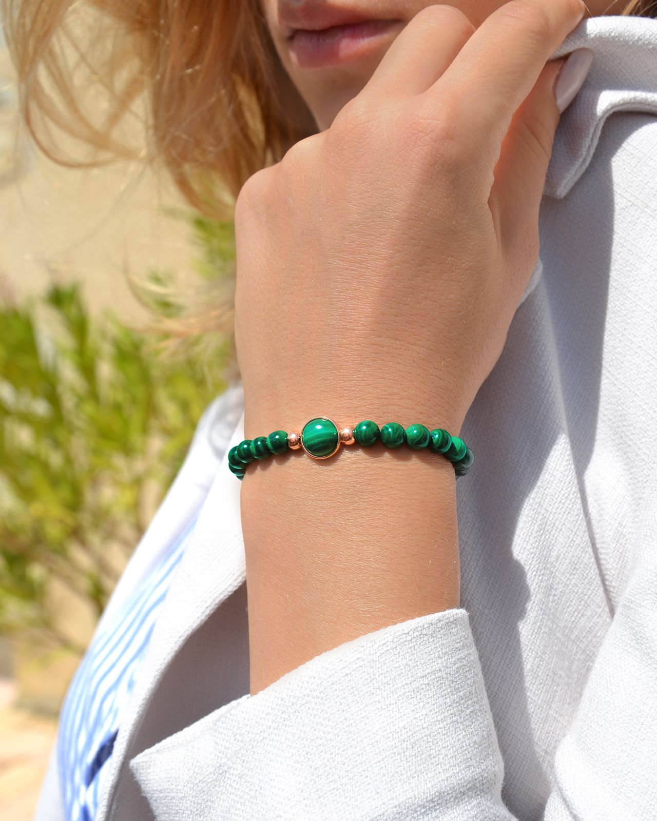 Le bracelet Torassi en pierres naturelles est composé de magnifiques malachite. La pièce centrale est un cabochon en acier doré à l'or fin rosé serti de sa pierre, donnant ainsi un coup d'éclat et de beauté à votre poignet.