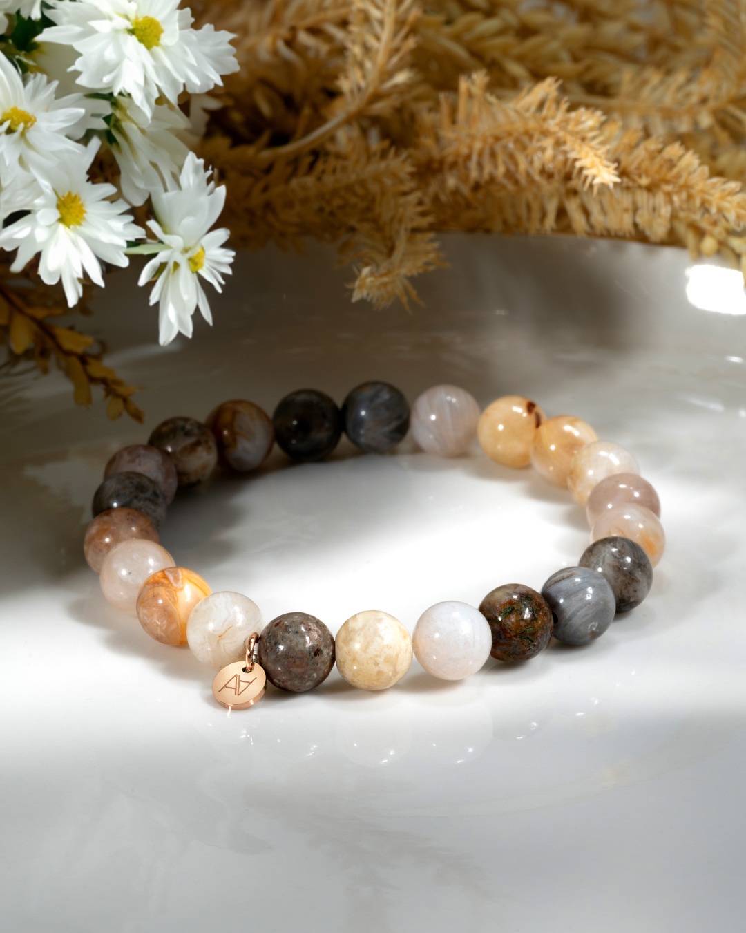 - Matière du bracelet Acier rosé inoxydable et Agate plume
