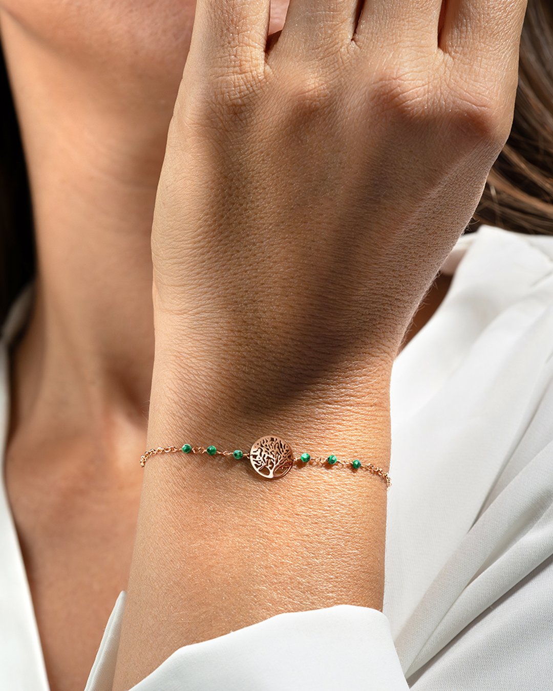 Le bracelet Venoti se caractérise par une chaine élégante ornée de six petites pierres facettés en malachite, mettant en valeur un arbre de vie en son centre.