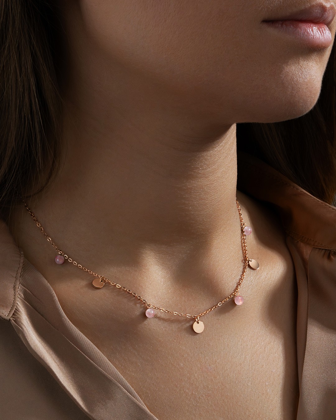 Le collier Comissinotto met en valeur 4 magnifiques quartz rose, soigneusement disposées entre des pampilles en acier rosé inoxydable, signées Anna Velazia.