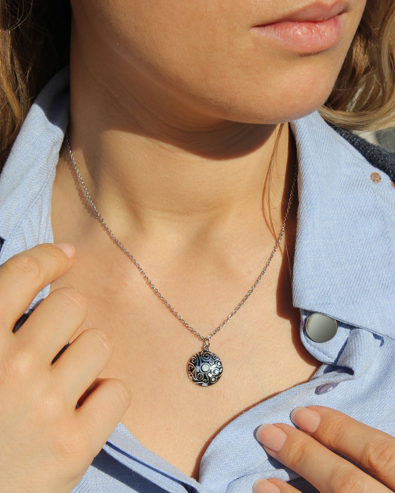 Sa petite chaîne argentée vient ajouter de la finesse au médaillon, créant ainsi l'harmonie parfaite.