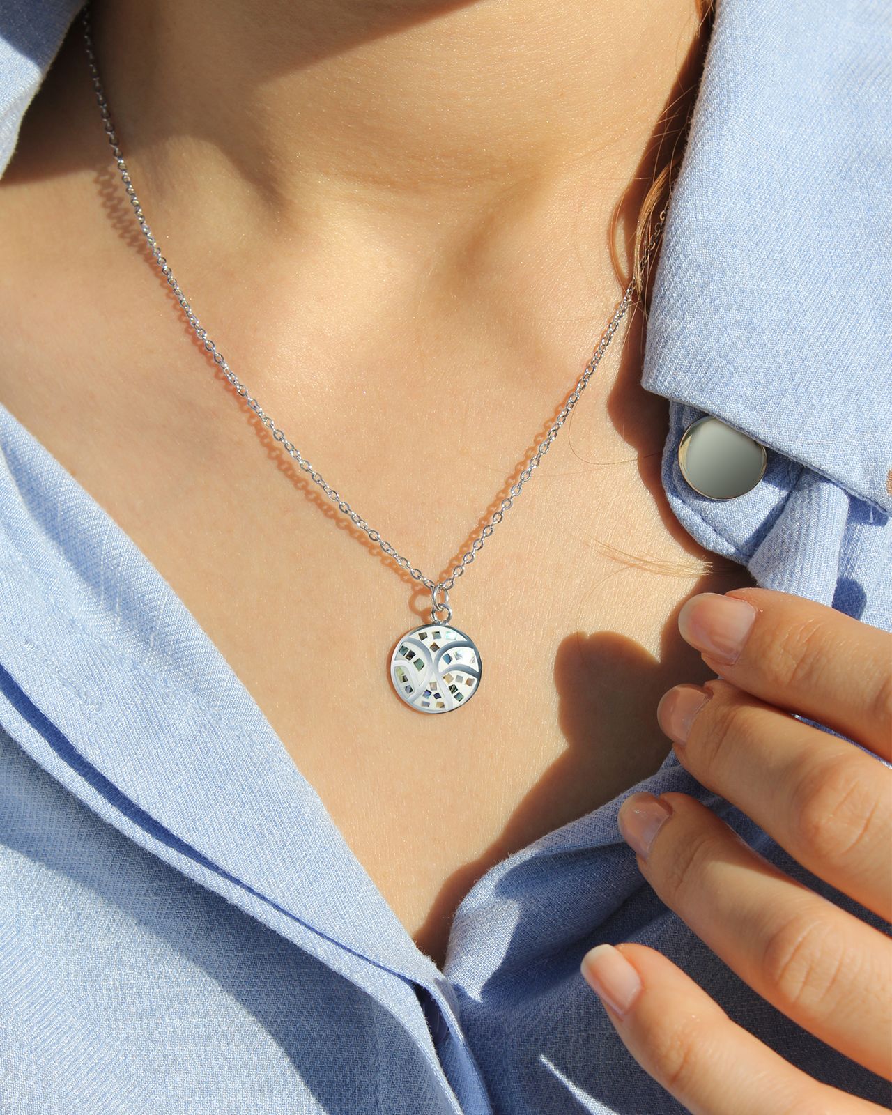 Les nuances de ses petites feuilles de nacre varient selon la luminosité et l’environnement qui l’entoure, créant ainsi un bijou à la fois discret et chic.
