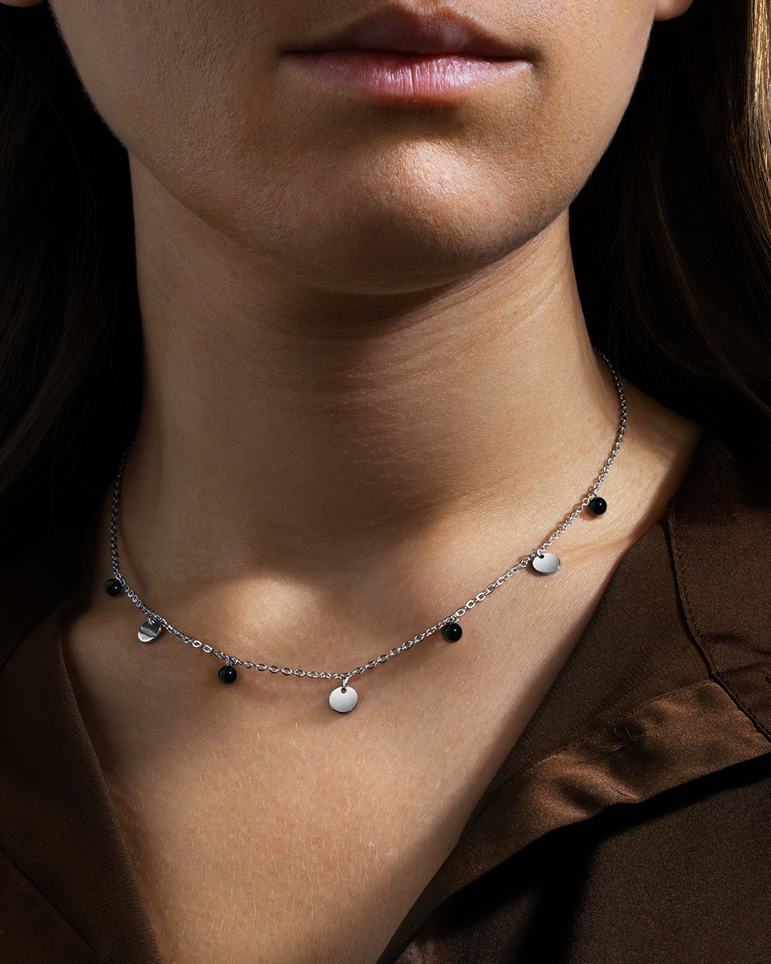 Le collier Toscanotto met en valeur 4 onyx, soigneusement disposées entre des pampilles en acier argenté inoxydable, signées Anna Velazia.