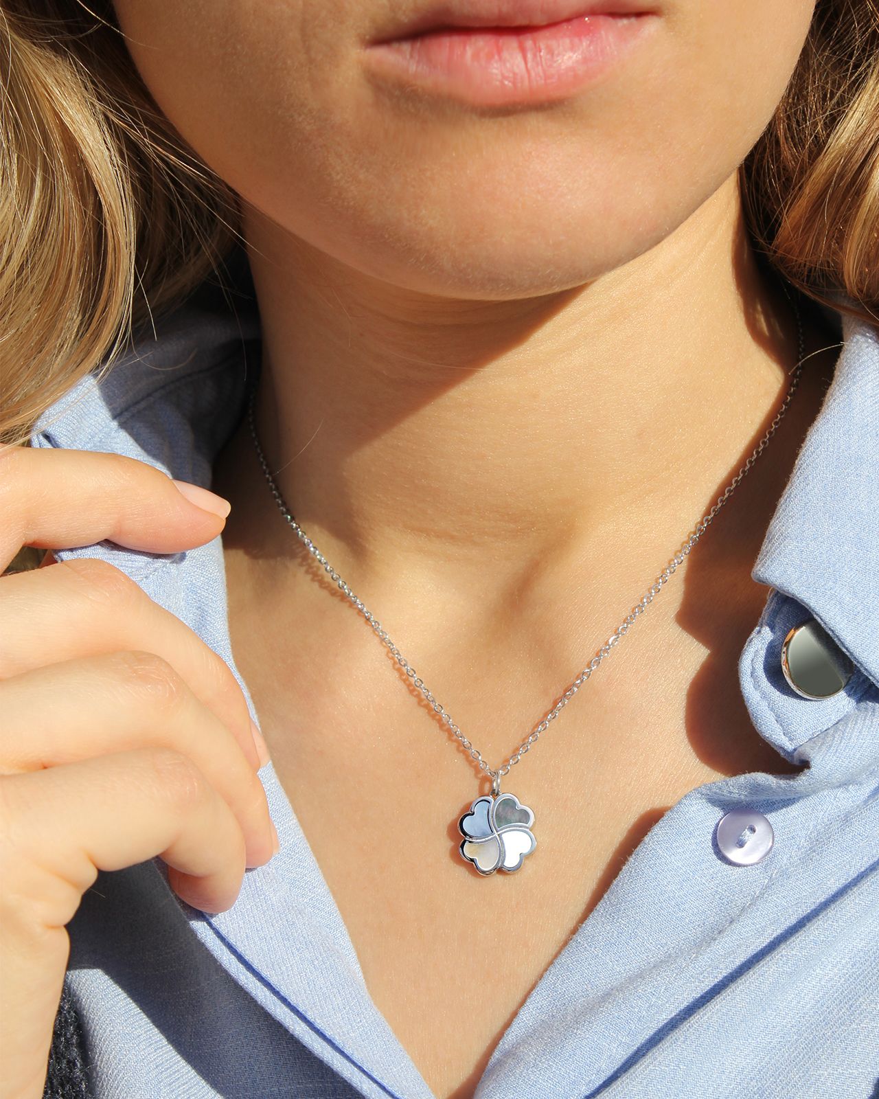 Ce bijou en forme de trèfle trouve son originalité au travers de ses différentes teintes de nacre habillant le corps de la pièce.