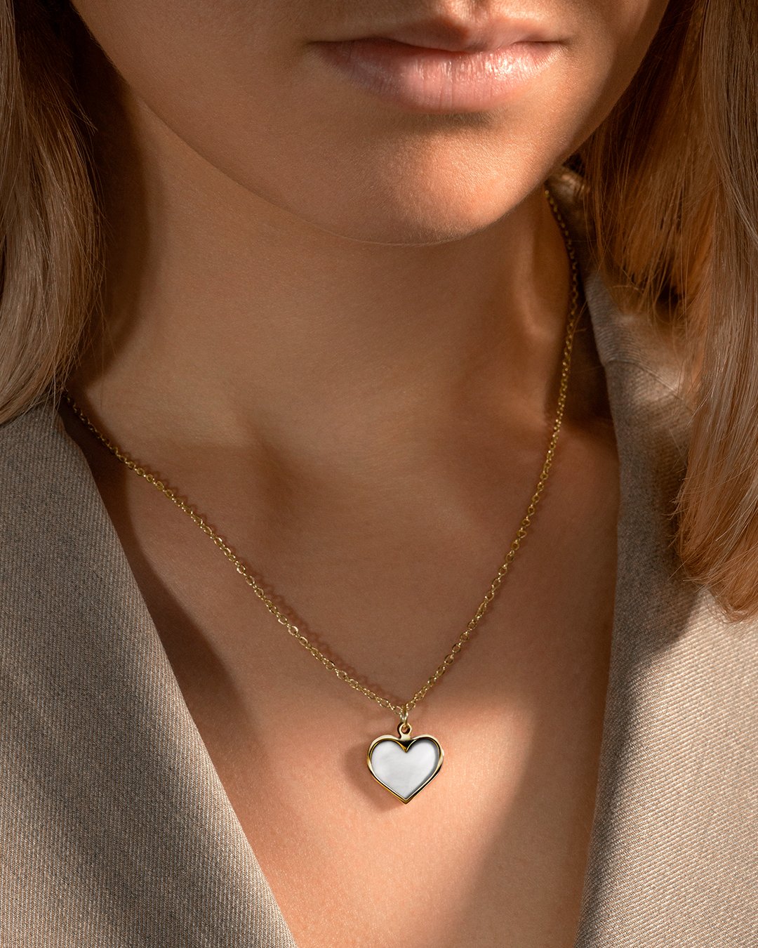Le pendentif Cuorettio Doro est en acier inoxydable doré accompagné de son médaillon nacré.
