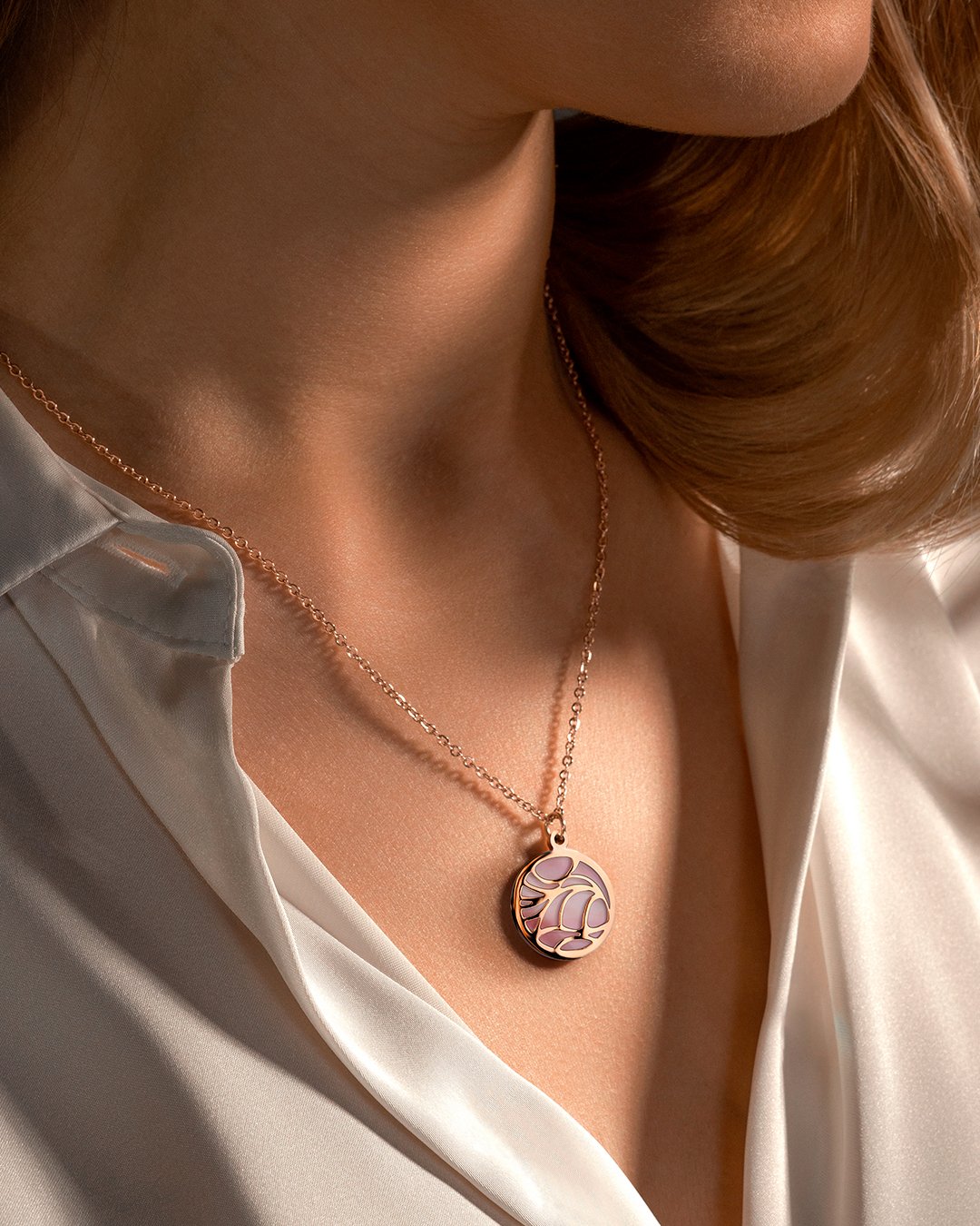 Le pendentif San Felizzio Rosa est composé d'une pièce de nacre enveloppée de son motif en acier inoxydable rosé.