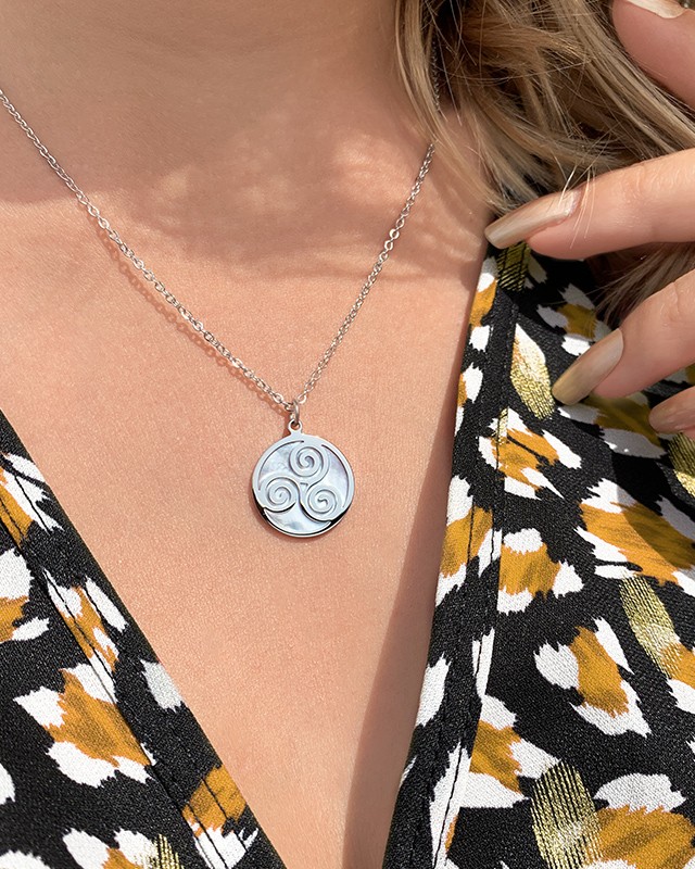 Le pendentif Triskelino est composé d'une pièce de nacre enveloppée de son motif en acier inoxydable.