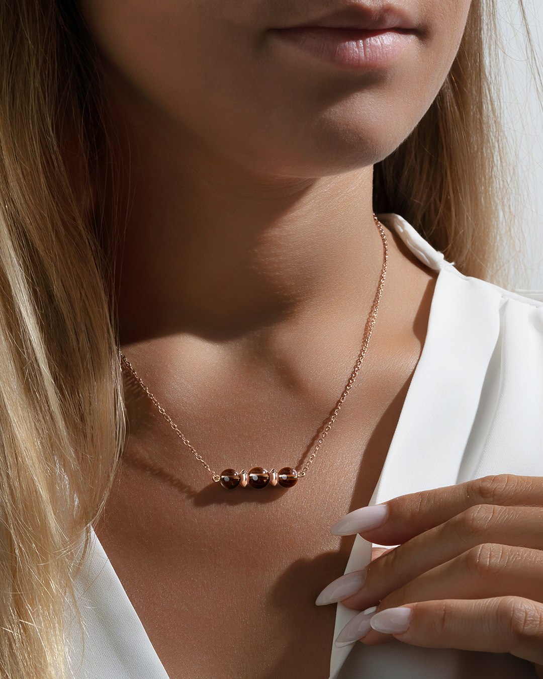 Le collier Catanina est composé de 3 pierres en quartz fumés, minutieusement disposées entre des séparateurs en acier rosé.