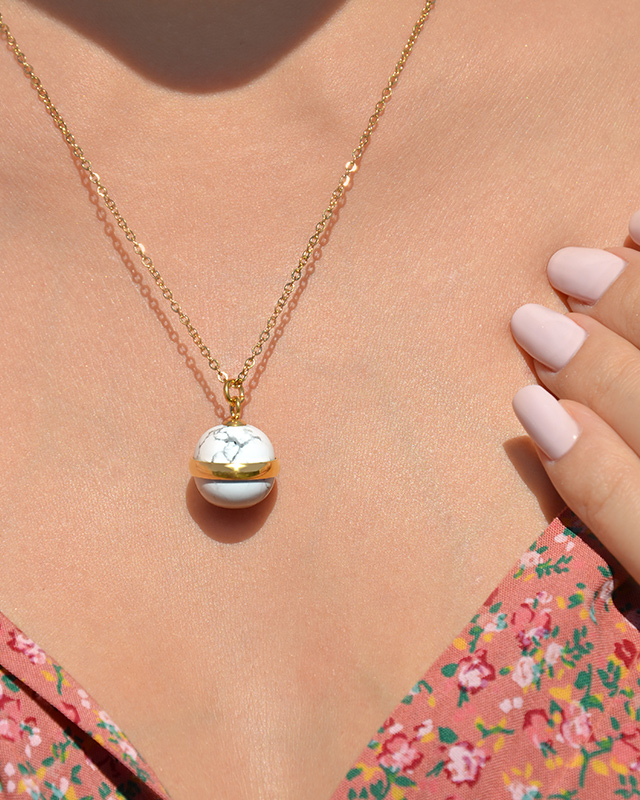 Le Bola Celzinio muni de son cerclage doré vient sublimer sa magnifique Howlite blanche nuancée par ses nervures grises.