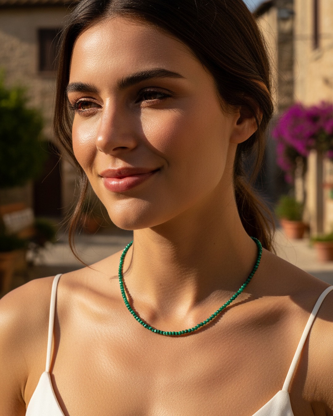 Le collier Venola met en valeur un délicat ras de cou composé de fines pierres facettées en malachite de 2 mm.